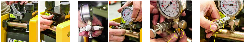 Remove the plug and thread in your gauge. Press the indent knob to check pressure.